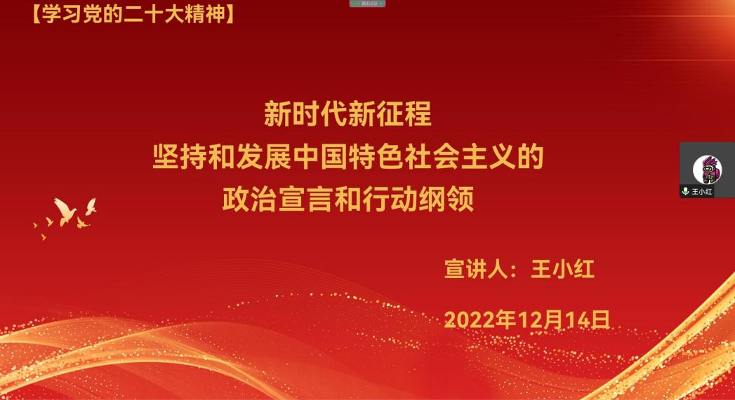 12月14日下午,米乐官网线上召开党委理论学习中心组学习(扩大)会议,邀请米乐官网"党的二十大精神宣讲团"成员、通识教育学院党总支书记、思政课教师王小红副教授围绕党的二十大精神,作题为《新时代新征程-坚持和发展中国特色社会主义的政治宣言和行动纲领》的专题报告。在校校领导、党委委员、党总支书记参加会议,宣传统战部部长杨婷婷主持会议。
