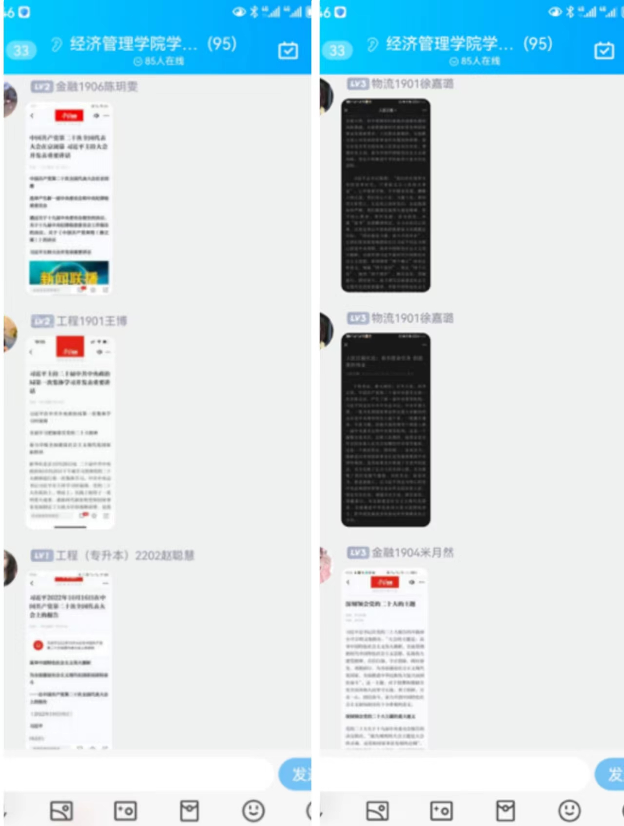 12月15日,经济管理学院第二党支部各学生党员以个人自学的方式,通过学习强国、微信公众号等平台学习了“推动中华民族伟大复兴号巨轮乘风破浪、扬帆远航——党的二十大报告诞生记”“二十大报告,习近平总书记强调‘三个务必’”“深入学习领会党的二十大精神”等文章,并在学习交流群中自觉打卡,并且积极讨论心得感悟,领悟党的二十大精神实质。